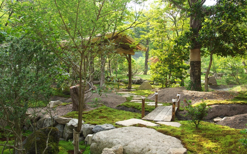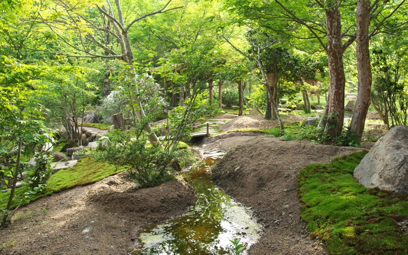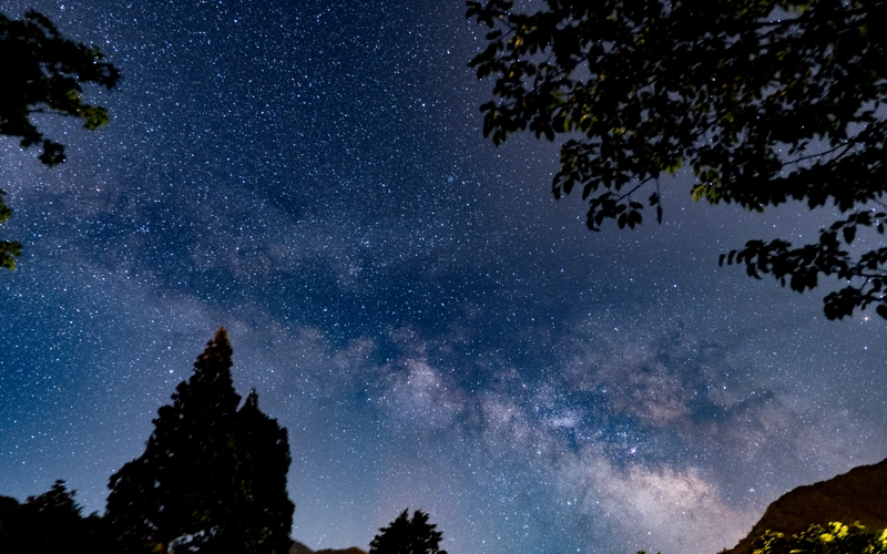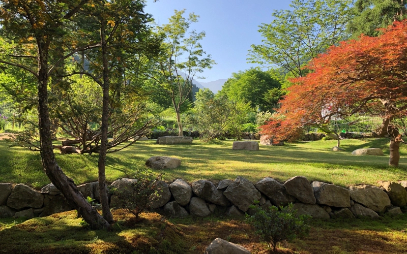 令和元年の蒼の湯リニューアルに続き令和2年春、山椒畑だった土地(約350坪)に土を盛り、池や小川を作り、飛騨の山から大きな木々を移植して奥飛騨の四季折々の自然を感じて頂ける場所が出来あがりました。 栗の木で組んだ東屋からは、初冬や春先に真っ白に浮かび上がる標高2525メートルの十石山がご覧頂けます。 芝生を貼った蒼の広場では、晴れた夜に無数の星が広がり天の川など満点の星空が楽しめます。